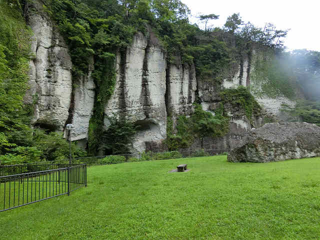 この公園は、露天掘りによって切り開かれた大谷石の岩肌に、高さ27mの堂々たる容姿の平和観音像が刻まれ、周囲の起伏に富んだ地形と、松や広葉樹の自然林と相まって、独特の景観をかもし出している異色の公園として、多くの観光客や市民に親しまれています。